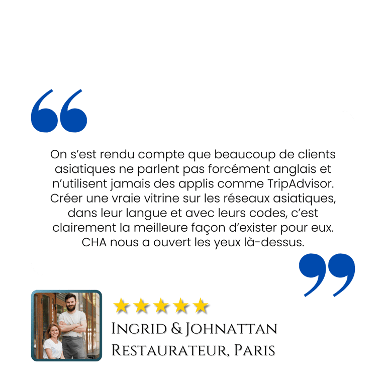Nous créons une véritable vitrine digitale pour votre établissement sur les plateformes Chinoises, Coréennes et Japonaises les plus utilisées par les voyageurs.